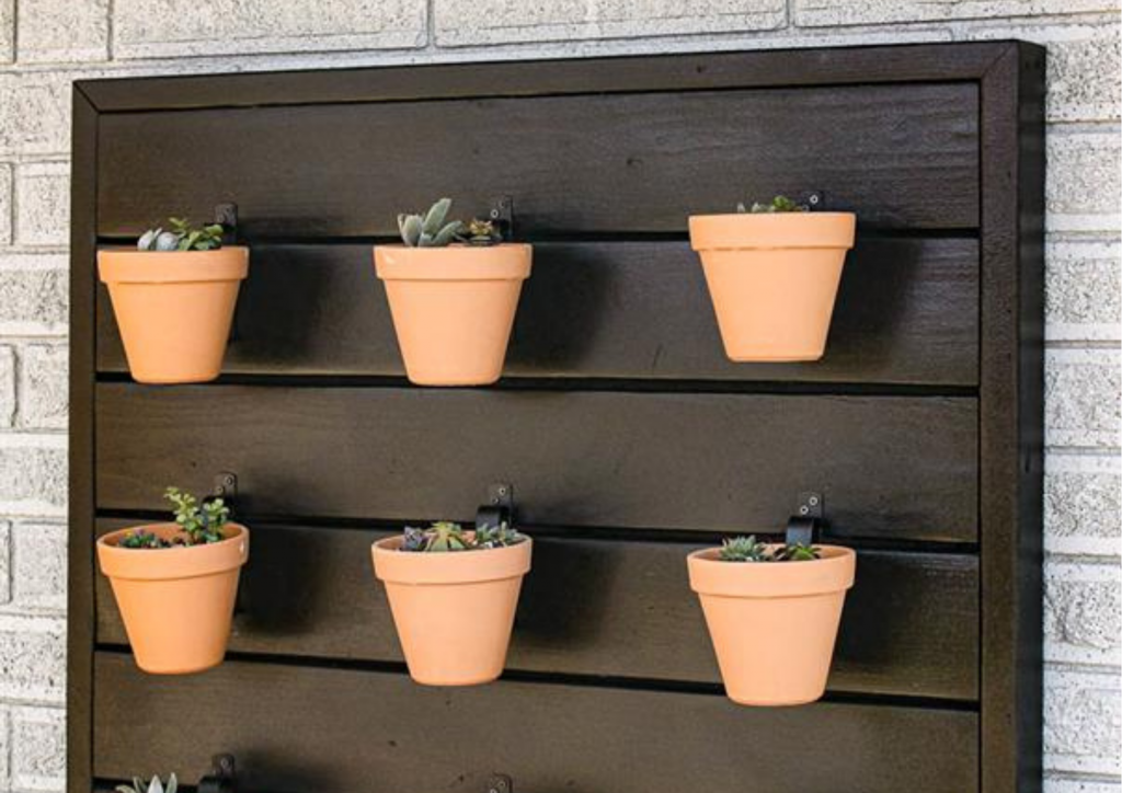 This DIY outdoor plant wall is perfect for spring and summer! This easy build incorporates pocket hole joinery and is mounted on the exterior of your house to spruce up your backyard or add more curb appeal in your front yard. Mount terracotta plants and add succulents or even start a herb garden!