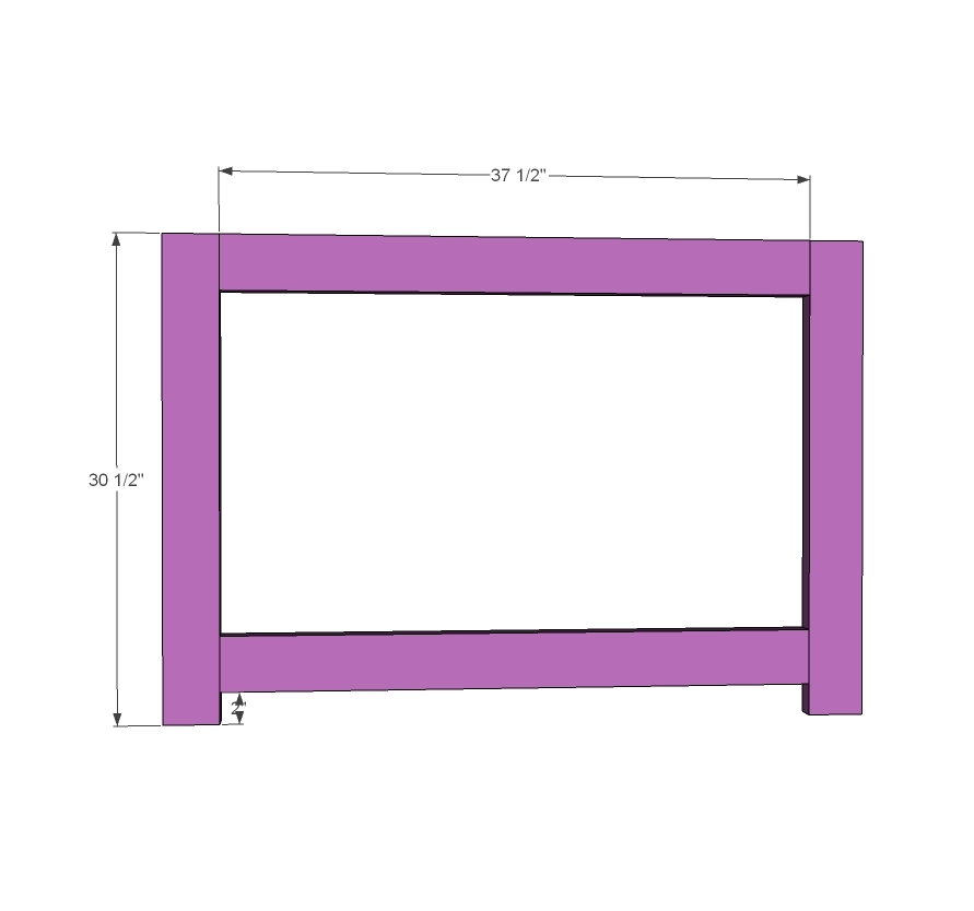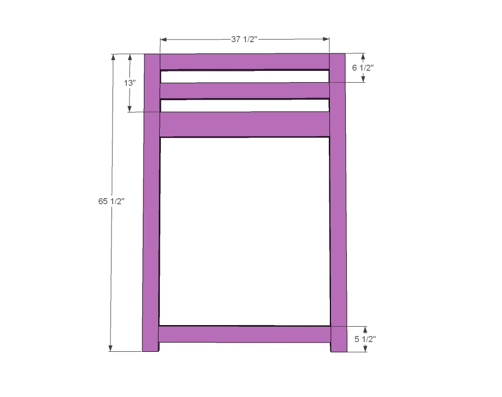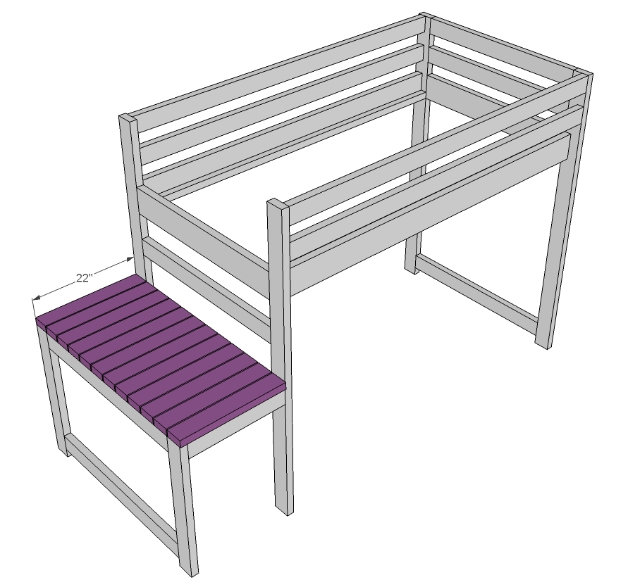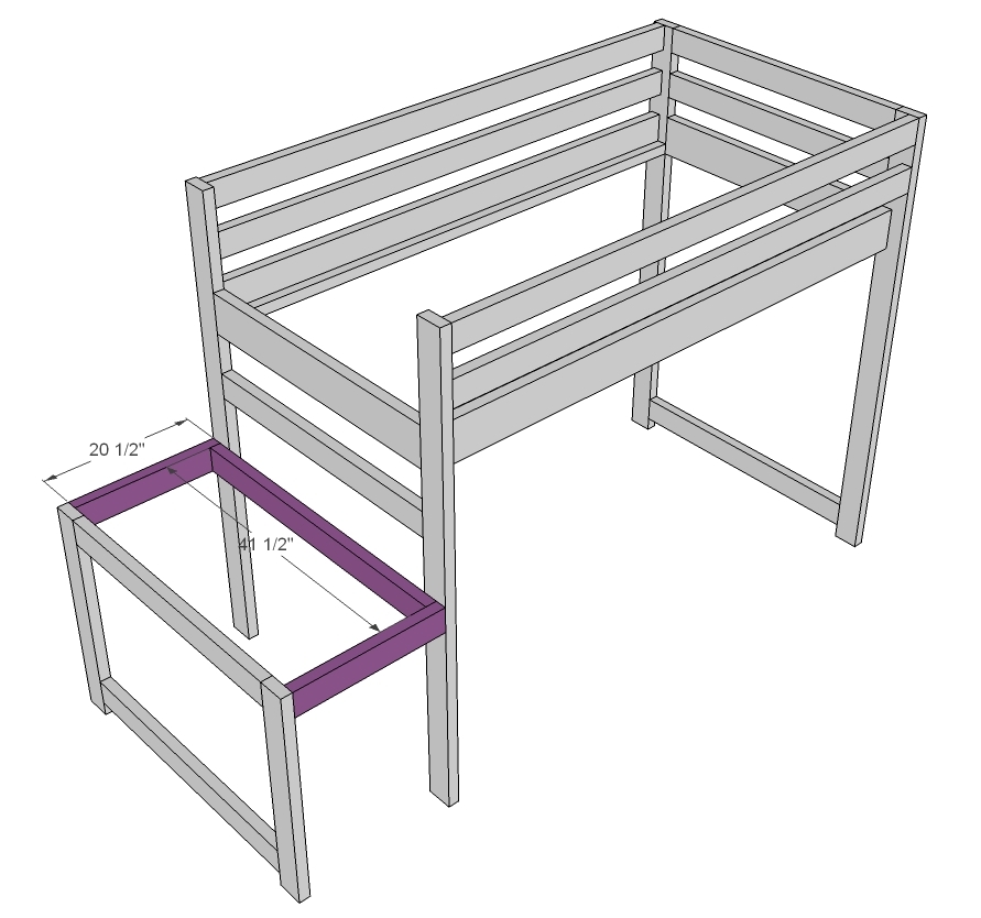 Build the ladder end as shown in diagram with 1 1/2″ pocket hole screws and 2 1/2″ pocket hole screws. Use glue to fasten – these joints are permanent. If you are building this loft bed without the stair platform, add 2x4s (38 x 89 mm) all the way down to make a “ladder” for the kids to climb up.