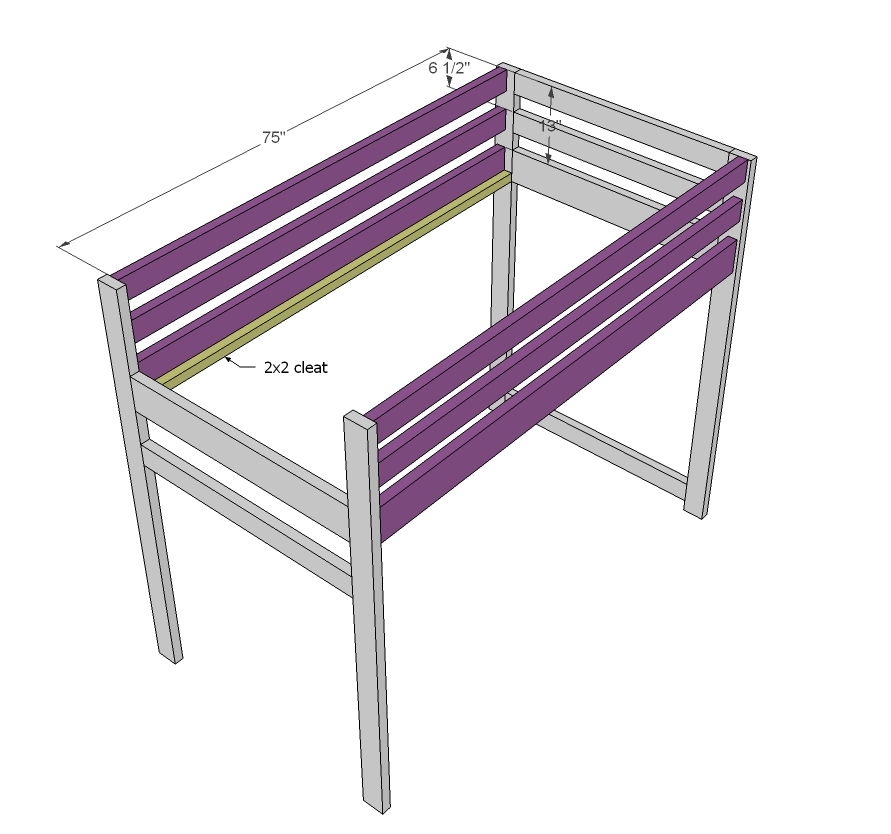 Now here’s where we skip the glue. To make this loft bed easy to disassemble, I did not use glue here. The inside width for the mattress area should be 39″, in setting the side rails 1 1/4″ from outsides. I did this so that your pocket hole screws have lots of board to grab into. This bed has NOT been weight tested or guaranteed. If you feel you need extra support – add metal brackets under the 2x6s (38 x 140 mm). An alternative method is to attach metal bed brackets directly to the ends if you have those. Notice the cleat is added in this step too. I used 2 1/2″ screws and glue to attach, screws every 6-8″ all the way down.