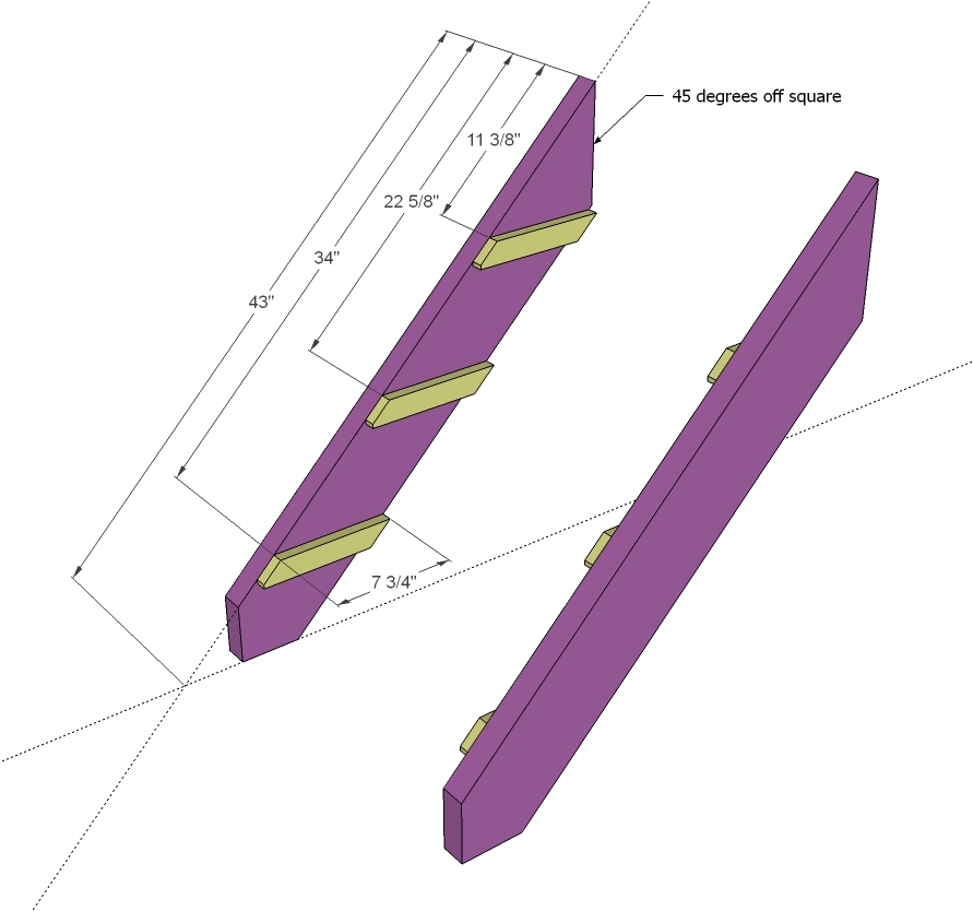- 2 – 38 x 140 mm @ 43” (both ends cut 45 degrees off square, ends NOT parallel) – to be trimmed down in later steps