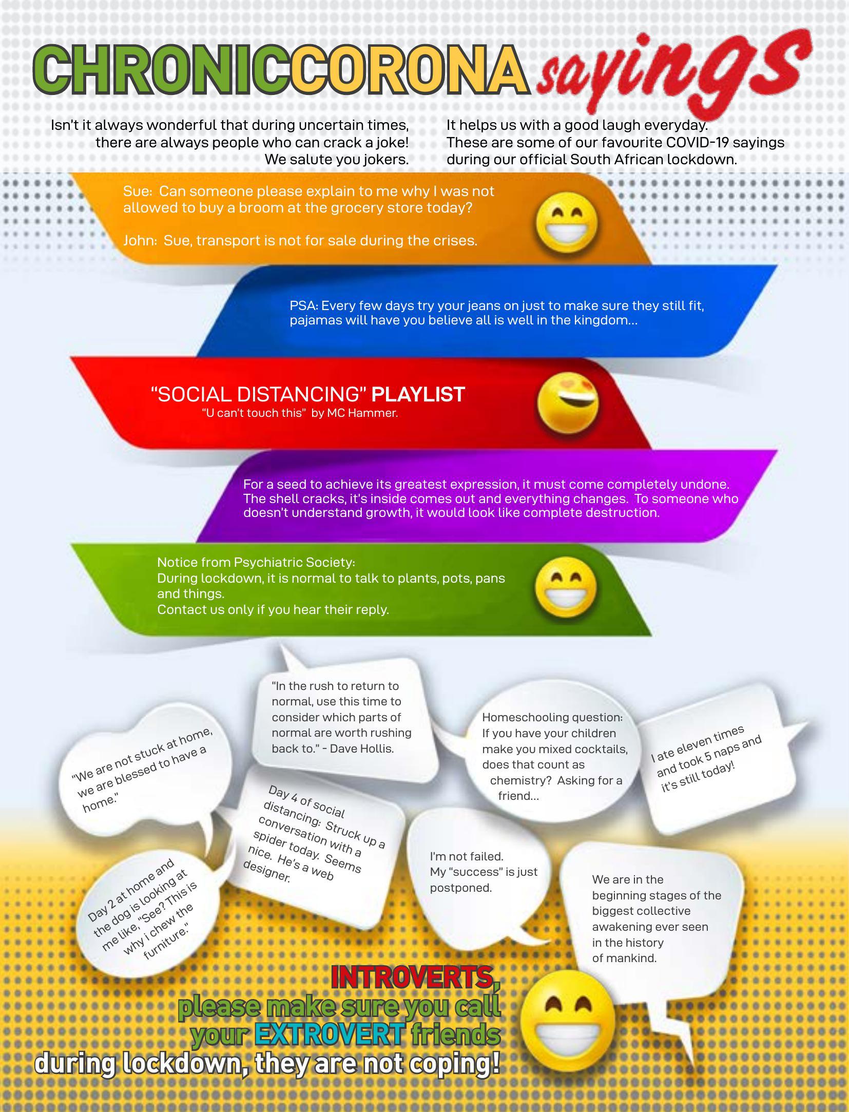 Isn’t it always wonderful that during uncertain times, there are always people who can crack a joke!  We salute you jokers. It helps us with a good laugh every day. These are some of our favourite COVID-19 sayings during our official South African lockdown.
