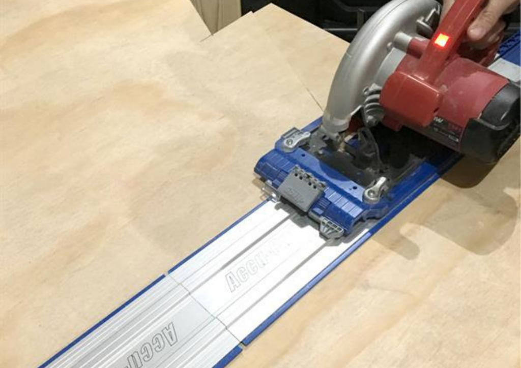 Once the holes are marked and you’ve measured the shape of your tree, cut the tree out with a circular saw and the Kreg Accu-cut track guide. The Accu-cut track guide helped us keep our cuts straight and accurate. I use this guide pretty much any time I use my circular saw. Please note: This photo does not show the holes marked, that is because we marked the holes on the backside. It Iis wise to mark where your holes will be before you cut your tree, that way you have a square sheet of plywood to measure from the edges.