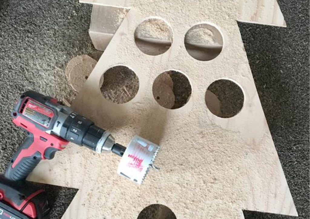 Using a 3″ hole saw, cut the holes in your tree. You should cut the holes from the front side of the plywood. If you marked the holes on the backside of your tree, simply drill a small hole from the back. Then you will have a pilot hole to drill your holes from the front side.