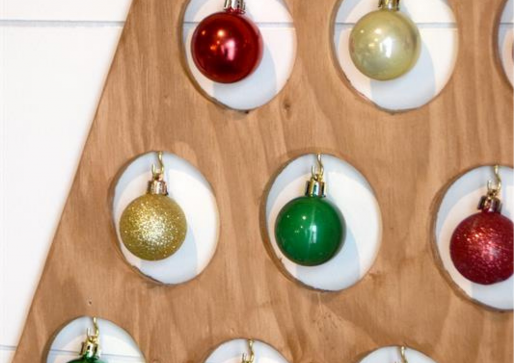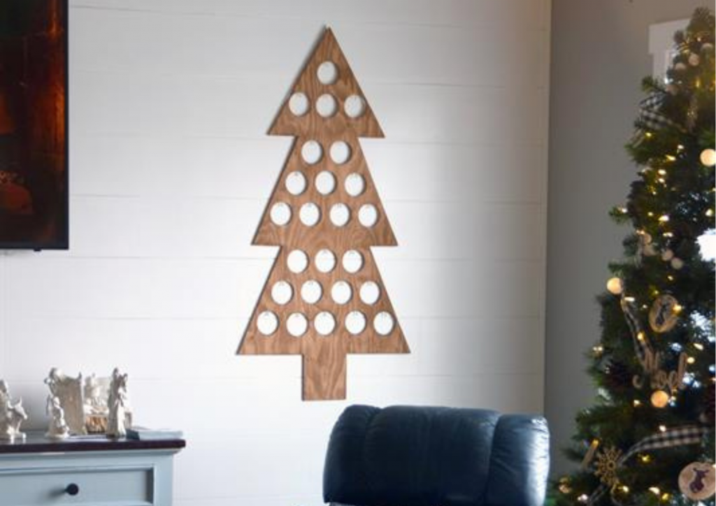 This DIY Christmas tree advent calendar is a simple, minimalistic approach to the traditional advent calendar. There are 25 holes drilled in this tree, leaving a place to hang an ornament a day in December. You can also use this instead of a traditional Christmas Tree, and still have a place to hang your favourite ornaments.