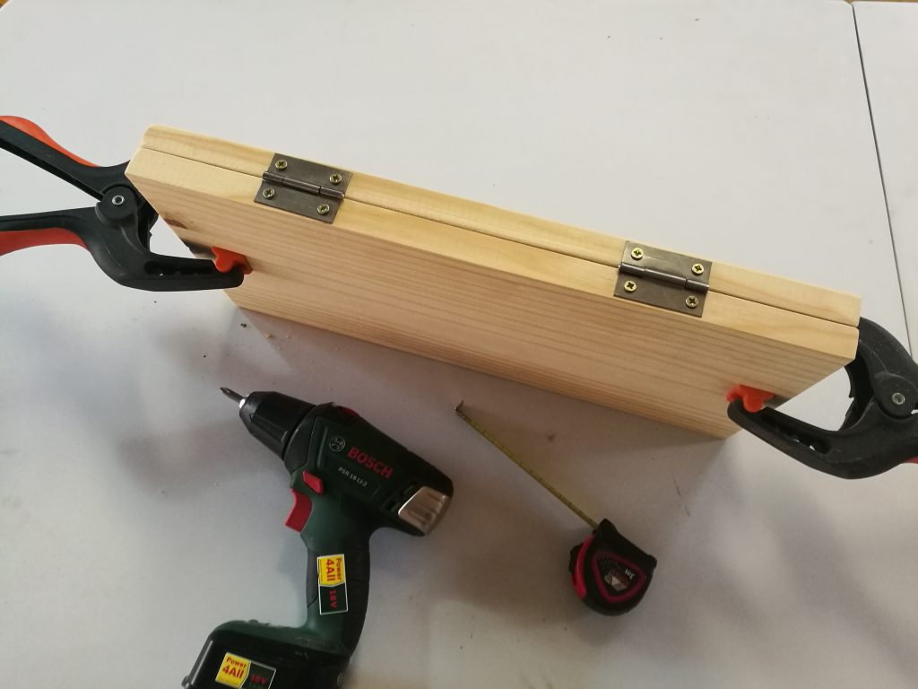 Using a power drill/screwdriver, lay the two pieces of wood side by side so that they are flush, place the small hinges flush on the edge of the two spines of the pieces and secure the hinges to the wood with short wood screws (see image).