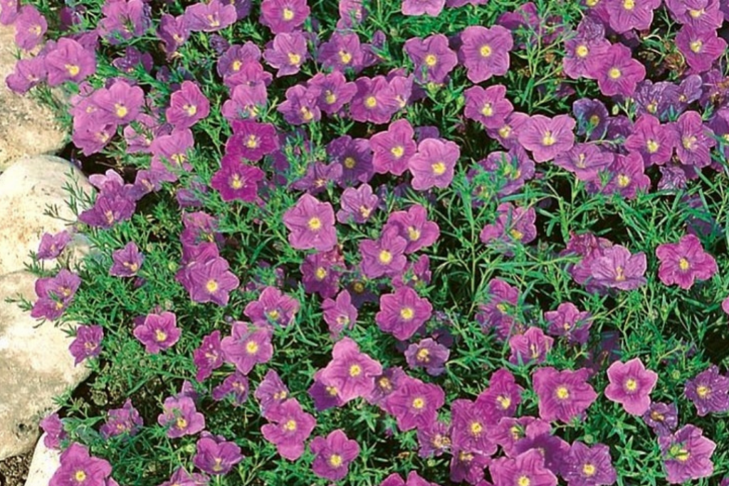 The cup flower grows into a graceful, spreading mound which produces thin, five-petal flowers in shades of purple, blue and white. Each flower has a deep purple centre which flowers throughout summer and into autumn.
